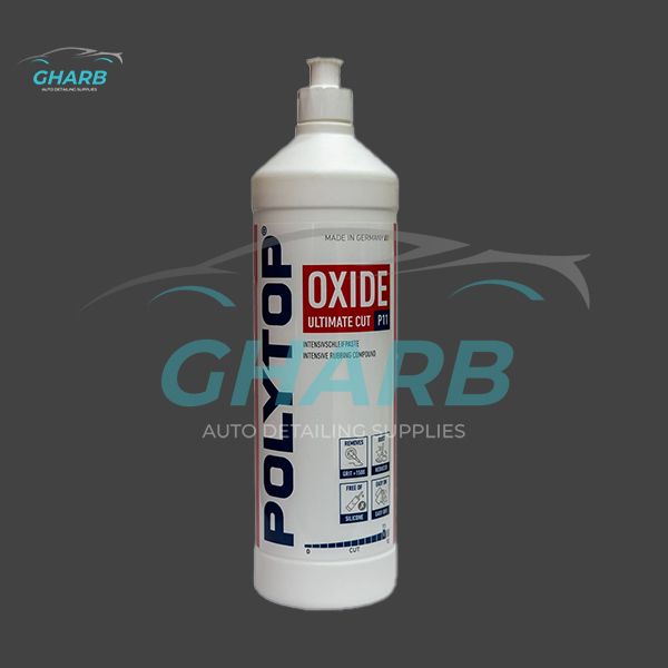پولیش زبر یک لیتری پلی تاپ مدل Polytop Oxide Ultra Cut 1l یک مایع پولیش زبر فاقد سیلیکون می باشد که به دلیل مواد تشکیل دهنده بسیار ساینده عملکرد لایه برداری بسیار بالایی دارد. ریز ذرات اکسید آلومینیوم به کار رفته در فرمول این پولیش ماشین برای کار با دستگاه پولیش روتاری و اوربیتال به گونه ای بهینه شده است که گرمای بسیار کمی تولید نماید و با شروع پولیش کاری سطحی براق و یکدست بدون هولوگرام را ایجاد می نماید. پولیش زبر یک لیتری پلی تاپ مدل Polytop Oxide Ultra Cut 1l گرده تولید نمی کند و پس از پولیش کاری به راحتی پاک می شود و آثار خط و خش و علائم سنباده را تا دقت 2000 از بین می برد.